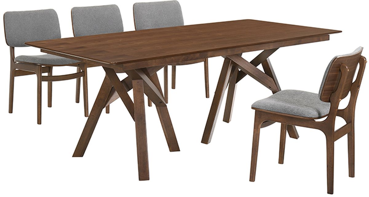 The Armen Living Cortina and Lima mid-century dining set boasts an ideal combination of comfort and style that is certain to make every family gathering relaxing and memorable. The Cortina's Walnut Veneer frame and beautiful top are complemented beautifully by the Lima's stylish grey upholstery and sleek construction. The Lima's cushioned back design make the side chair not only appealing to the eye, but perfectly supportive as well. The Cortina/Lima combination is designed to complement any mid-century dining room decor but features a versatility that makes it work well in just about any room of the house. The Cortina/Lima set comes with 1 dining table and 4 dining chairs.
