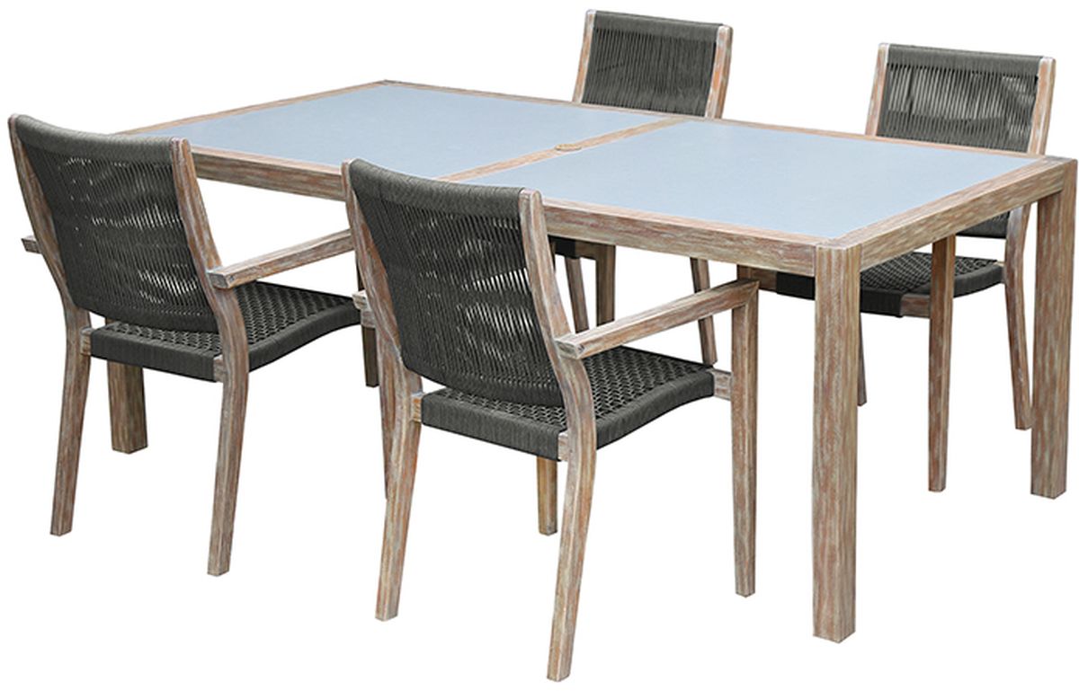 The Armen Living Sienna and Madsen Acacia Outdoor dining set promises an unmatched degree of comfort and dependability, making it an ideal choice for your outdoor space The Sienna's modern design boasts a Acacia frame brilliantly complemented by the table's stylish super stone inlay top. This combination finds its ideal match in the Madsen's sleek Acacia frame. Stylish and exceptionally comfortable, the Madsen offers a supportive frame wrapped in a sophisticated charcoal fishbone rope weave. The Sienna/Madsen combination is designed to fit in any outdoor dining space but features a versatile appearance that makes it perfect for an indoor space as well. The Sienna/Madsen set comes with 1 dining table and 4 dining chairs.