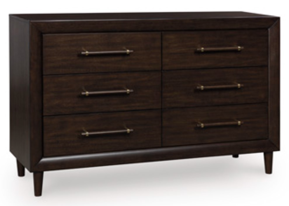 The Mallenette dresser brings subtle warmth and function to your bedroom. Its merlot finish highlighted with a gentle brown over replicated wood grain provides a touch of charm. Featuring six practical drawers accented with dark bronze hardware.Read More