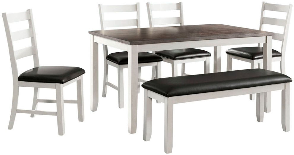 Create a warm, welcoming dining space with the Martin dining set. Featuring a rich dark brown table, four ladder-back chairs, and a matching bench with upholstered seating, this two-tone set blends classic charm and casual comfort—perfect for everyday meals, family gatherings, or cozy dinner nights.Read More