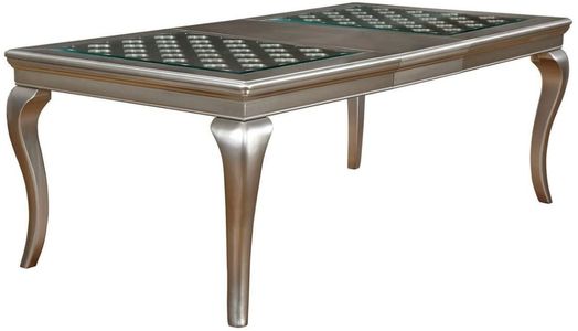 This dining collection will be the focal point of any home with its eye-catching silver finish and elegant structure. Double glass inserts draw attention to the Moroccan-inspired inset patterns while a convenient 18-inch leaf offers the option of hosting a large or intimate dinner. This dining set is the perfect statement addition to any dining area.