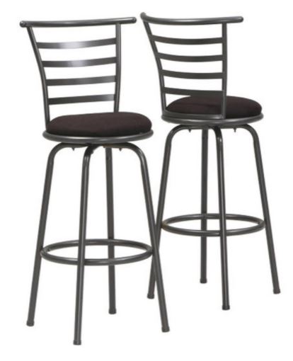 This sleek and contemporary set of 2 metal barstools finished in a dark silvery grey color is perfect for all types of entertainment and dining spaces. With a high slightly curved horizontal slat back, comfortably cushioned black microfiber 360 degree pivot.Read More
