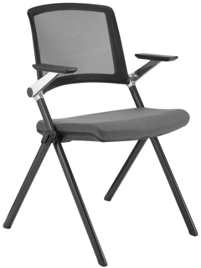 The black metal frame features two x shaped legs on either side which rise up and attach to the two armrests on either side. The seat is covered in a smooth gray fabric while the back support has a black mesh covering it. These versatile chairs are easy to stack and store or fold to store away. Great for home or office use.