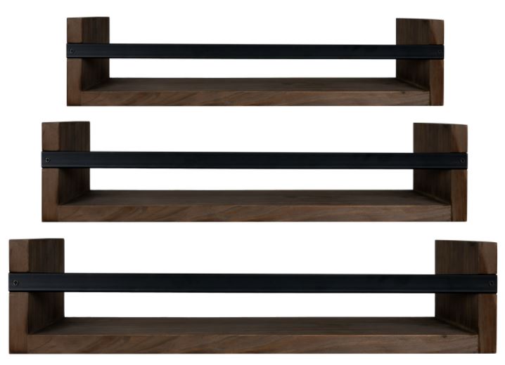 Made of 85% wood and 15% metal, this is set consists of 3 shelves, each flaunting a dark stained wood base with grain details and a matte black metal front handle.