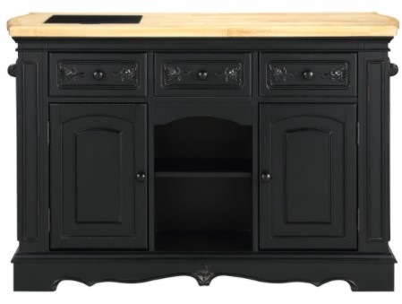 This kitchen island features three deep drawers, which are ideal for storing anything from cooking utensils to storage containers. Behind the two cabinet doors are adjustable shelves and an abundance of storage space. The kitchen island features a natural finish top that will easily enhance your decor. This island offers side storage and a towel rack that comes in handy for quick and easy cleanups. Style, function, and quality make this lovely piece a fantastic addition to your home.
