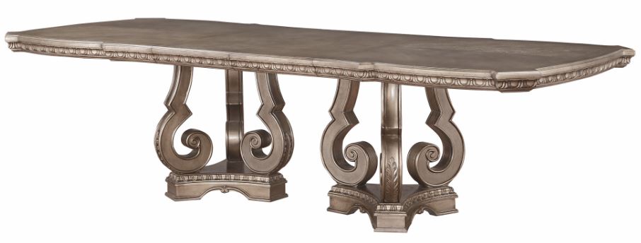 This rectangular table is supported by wood double pedestal with each pedestal including three-scrolled legs on a plinth base in antique champagne finish.