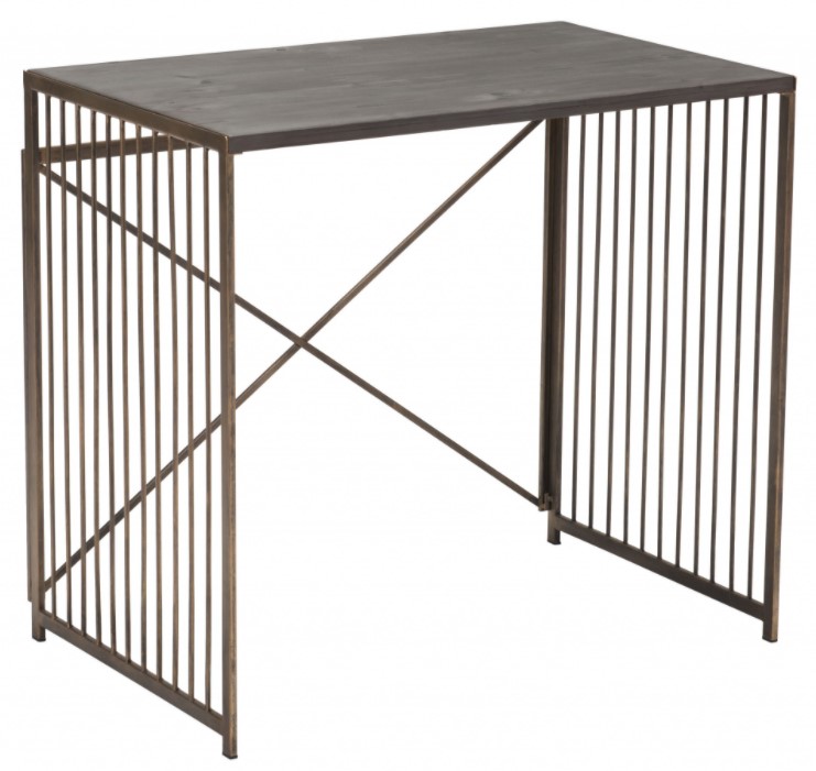 Contemporary in style this sleek desk is a table concept with no drawers or cabinets - just clean and simple lines. The frame of this desk has two rectangular pieces on either side made up of thin rods. The rectangular sides have an X-shaped bracket attached at the back. The frame has a matte gold finish on it. The wooden tabletop has a gray-colored finish on it and has a slight texture to it. This desk can add design and utility to your office space, living room, or bedroom. 28.3" H x 31.5" W x 20.1" D