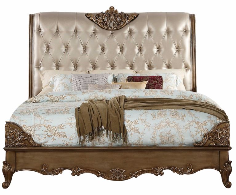 Inspired by mid-century royal style in Europe, our bed features button tufted sleigh padded HB with crown molding, apron trim low profile FB with raised scrolledecorners, wood Queen Anne legs and more accent details that makes this piece beyond the normal.Matching case goods for you to choose.Read More