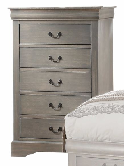 This chest drawer antique gray finish. 5 Drawers with brushed nickel metal hardware and center metal glides offer ample space for your clothes, bedding and linens. This beautiful chest will be the perfect complement from the most sophisticated to decor casual settings.Read More