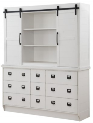 This buffet and hutch feature two barn sliding doors and nine storage compartments with six shelves, the hutch and buffet are complemented by the drawers that dovetail French front and back. High design is combined with a transitional style to create this charming piece that is set up to further accentuate the interior of your room.