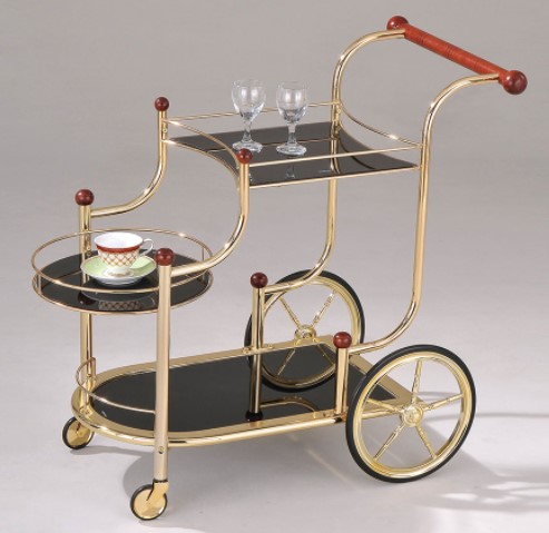 This serving cart stands at the extreme of sophistication and with its fashionable platforms, meals can better be served. Its gold plated frame highlight beautifully the whole design to give it a royal profile. This masterpiece features four elegant caster wheels with gold plated ream for easy mobility.Read More