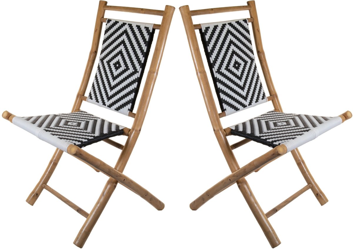 Increase your sitting capacity by adding a Set of Two Bamboo Frame Folding Armless chairs. This armless folding chair has a solid bamboo frame with a black and white woven seat. This bamboo chair is very comfortable and features a durable woven resin seat and back.Read More