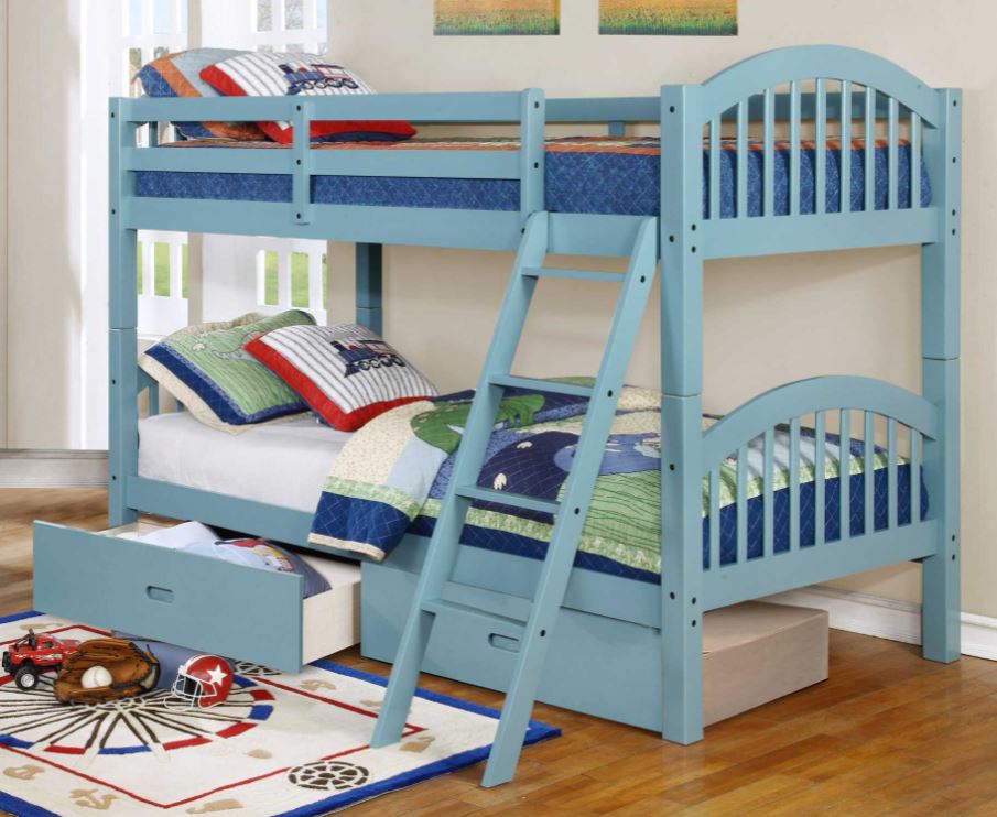Each bed in the bunk comes with an arched headboard and footboard for a unique profile. There is a slant wooden ladder attached to help you up and down the top bed. Wood slats provide ventilation for the mattresses and eliminate the need for a box spring. The beautiful blue finish makes this bed a lovely sight that complements your room setting. Comes complete with two drawer boxes for use under the bottom bunk, making this a great utilization of otherwise dead and potentially messy space.