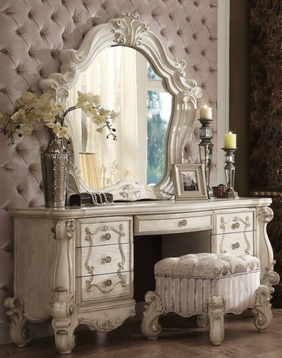 The Versailles vanity desk is the perfect accent to create the style of royalty your bedroom has been needing. This desk crafted in wood with a bone white finish was inspired by old European design with brown copper metal hardware and intricate wood carvings in front of the seven drawers.Read More