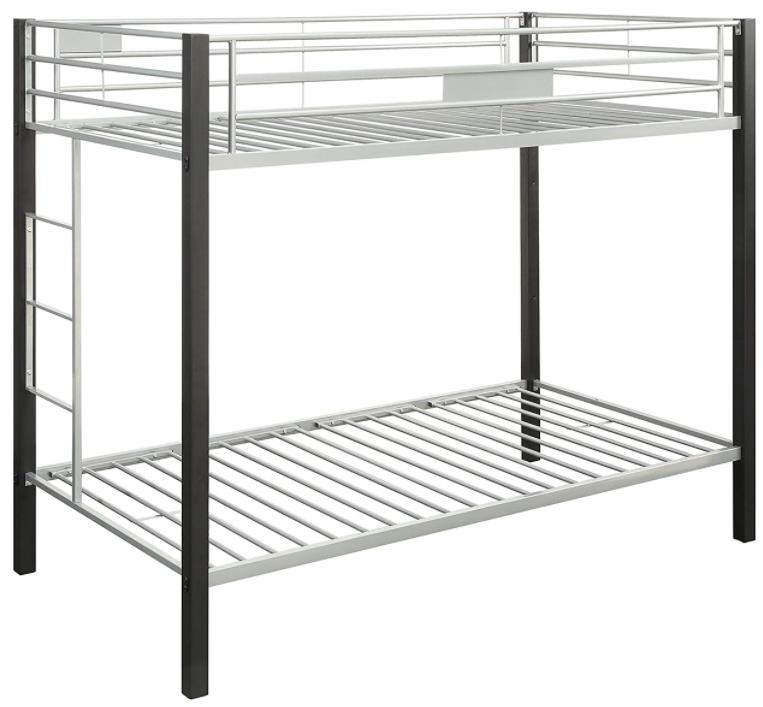 The convertible bunk can be used either stacked or as two separated beds, giving you a lot of creativity and flexibility on how to set up the room. Coming in a stunning silver and brown coffee metal finish with frame and sturdy slat system, this piece will surely be a creative addition to your kids space. Top bed not to be used for children below six years of age. The top has a weight capacity of 175Lbs while the bottom has 250Lbs. For residential use only.
