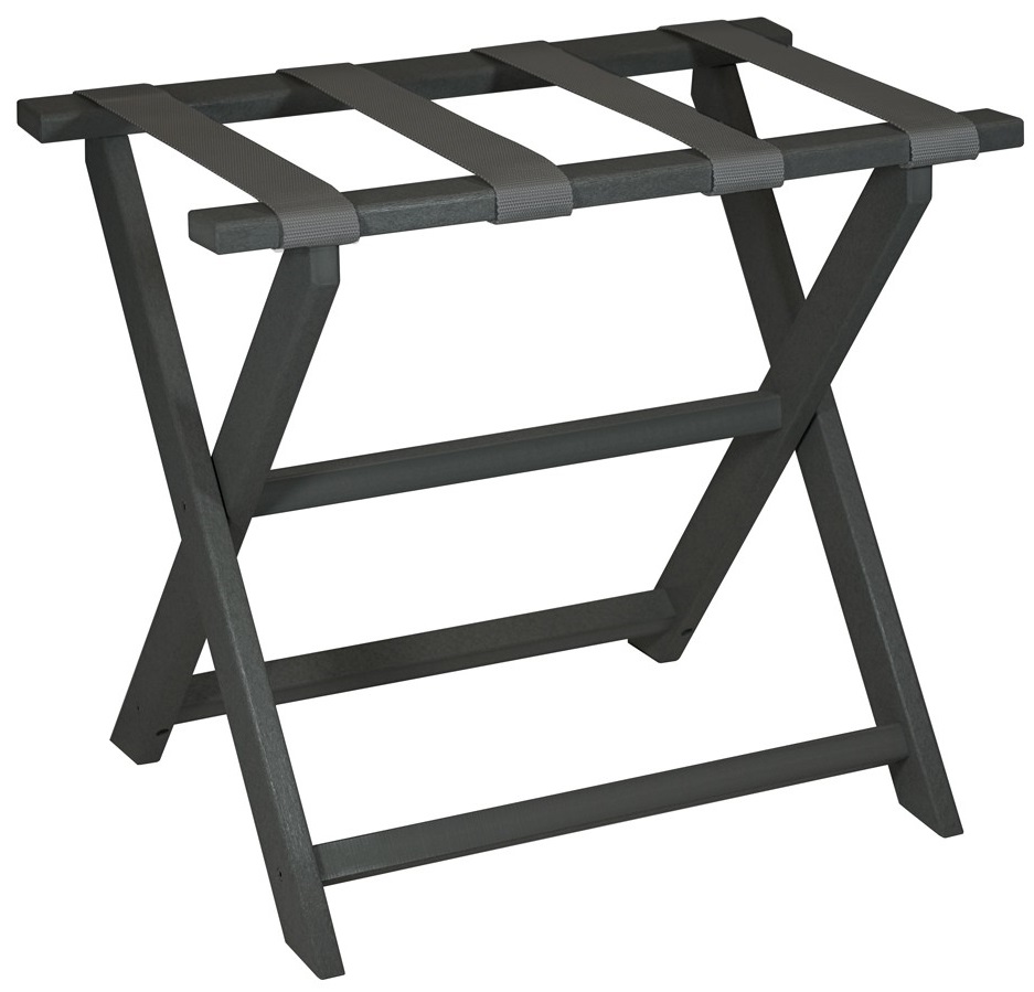 Feel better about your impact on the earth with this made in the USA, earth friendly dark gray folding luggage rack. This commercial grade quality rack is made of eco-friendly post consumer recycled plastic and has 4 super sturdy gray nylon straps.Read More