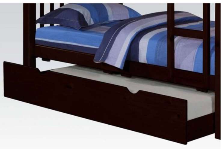 Modern styling pairs with convenience with this deep brown pull out trundle for under bed. Add a mattress to convert this pullout for extra sleeping or use empty for storage. Back wheels help pulling out to be a breeze. Designed to fit under bed or bottom bunk conveniently in a child's room.Read More
