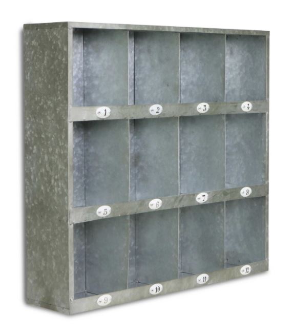 The square box shape has twelve different slots in it which have numbers written underneath them on white plates. This piece can be used anywhere in your home no matter what colors or decor style you already have. Use it to organize your files and letters, or as toy storage for a kids' room.