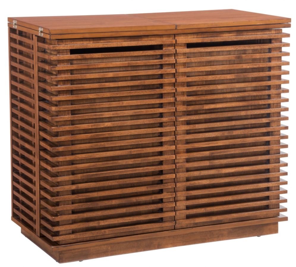 Scandinavian in design the Linea series features narrow slim strips of Solid Fir Wood, creating a Modern open airy design finished in a rich walnut finish. Bar Cabinet features 2 drawers, wine rack and ample room for glasses and cocktail preparation supplies.Read More