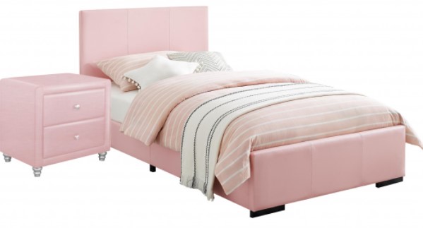 This bed has a unique pink coloring that looks great in any room. With this platform bed, no box spring is needed though can be used based on your mattress height preference. A complete slat system extends the life of your mattress. Don't be fooled by other beds with 4 or 5 slats and expect the mattress, not to sag. The 14 euro slats are properly spaced to provide full coverage and maximum support. Takes any standard mattress. Also comes with a nightstand to complement and complete the room!
