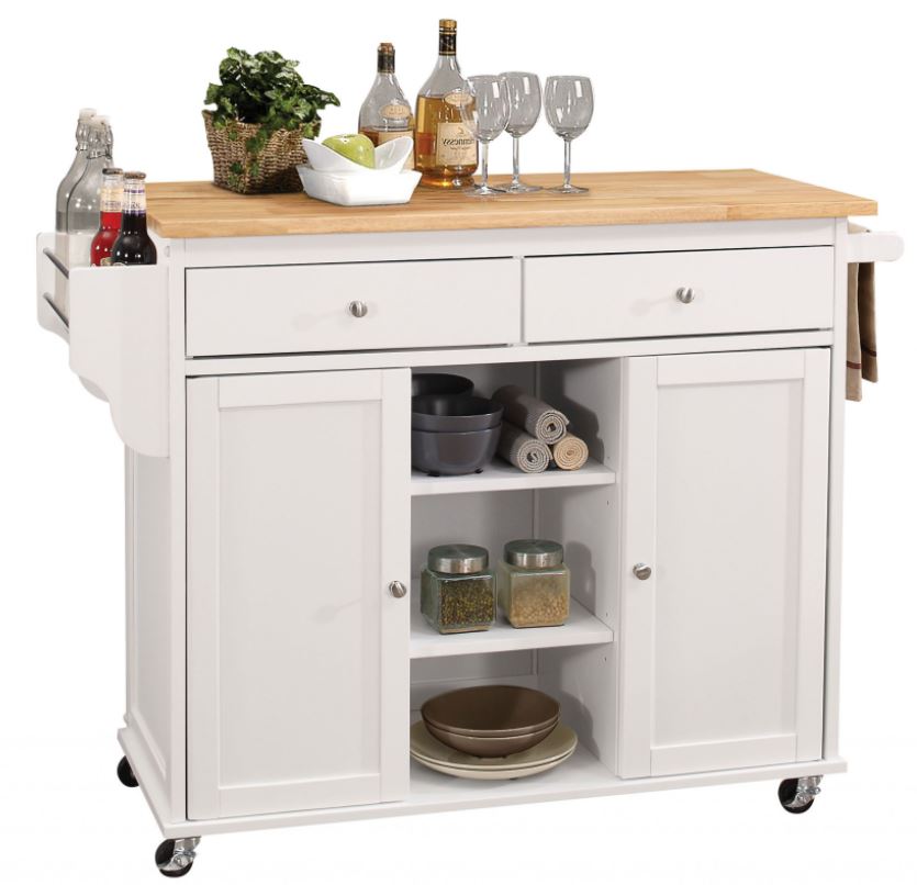Add modern storage space and charm to your kitchen with this wheeled kitchen island. The stylish white finish and natural wood top along with a silver handle and pulls make the cart an adorable addition to cottage, contemporary, or beach decor schemes.Read More