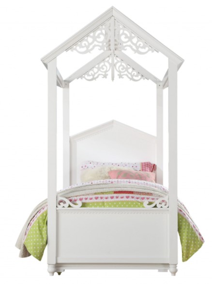 Your children will adore the magical bed that evokes the spirit and appeal of a cottage house. This unique canopy bed sits inside a classic house frame, with an arched headboard, low profile footboard and canopy with raised molding trim and scrolled motifs, all in a classic white finish.Read More