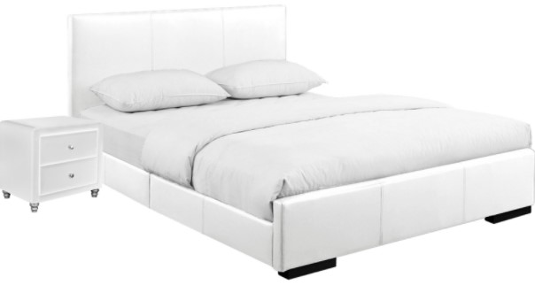 The upholstered headboard, accented by the low profile footboard-style frame, provides an elegant chic to the design. It has white coloring that looks great in any room. With this platform bed, no box spring is needed though can be used based on your mattress height preference. A complete slat system extends the life of your mattress. Don't be fooled by other beds with 4 or 5 slats and expect the mattress, not to sag. The 14 euro slats are properly spaced to provide full coverage and maximum support. Takes any standard mattress. Also comes with a nightstand to complement and complete the room!