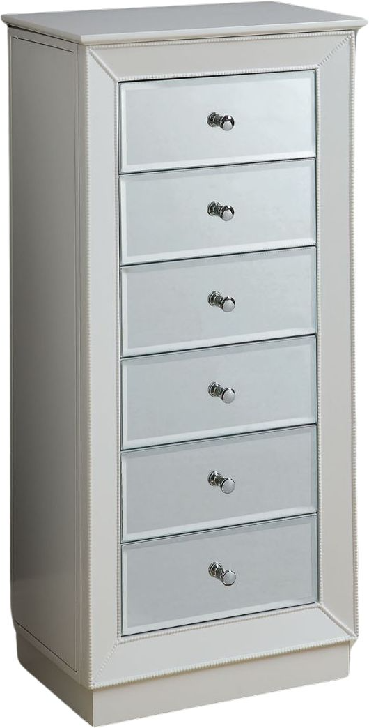 This bedside table features six storage drawers, two side doors with hook and a raised mirror on the top. We ensure each storage drawer is finely velvet lined. The multi-faceted wooden top rests on wooden base without legs with overall construction finished in charming white. This will perfectly anchor any room decor with enduring look and classic style. This armoire does not have a lock.