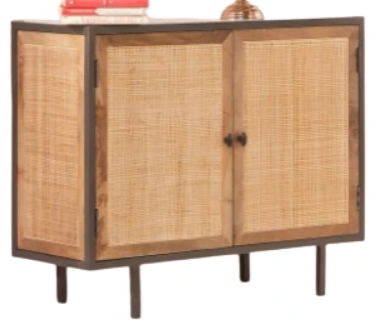 The adrian group features legged frames of iron in a natural finish. the door and drawer fronts are blended mango framed cane panels-as are the sides. Inset locally sourced marble top surfaces and black powder coated football shaped knobs complete these silhouettes.Read More