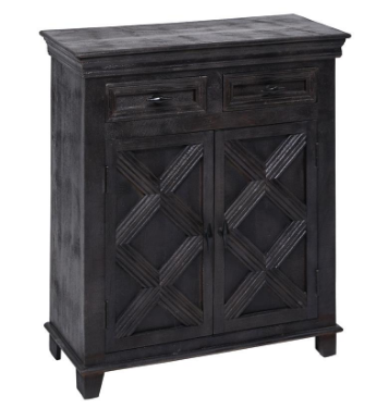 The Alderfer group is constructed, using tongue and groove joint methods, of mango wood in our water resistant lacquer sealed distressed onyx sand finish. Features of this versatile cabinet include routed and applied moulding detail, black powder coated iron pulls, two drawers and an interior shelved storage compartment.Read More