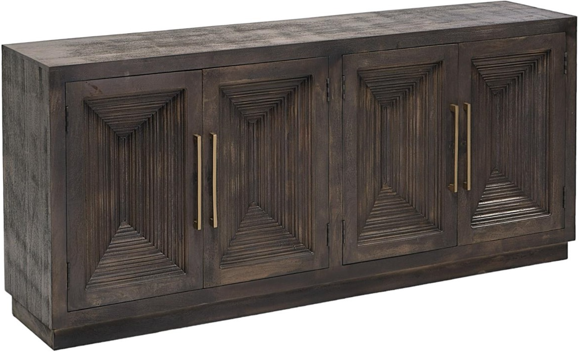 This sideboard is a sophisticated storage piece featuring a dark brown finish with intricate geometric patterns on its four doors. Made from wood, it offers ample storage space with a timeless, rustic charm. The brass-finished handles add an elegant touch to its modern yet traditional appeal.Read More