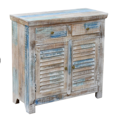 This versatile cabinet features brass finished "filigree" knobs, and a shelved interior behind a pair of fixed louver fronted doors with a shaped closer bar.