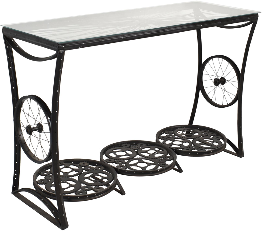 Rimmed and spoked-and also gear- wheels are incorporated into the design-and the tables are topped with Tuffen (toughened) glass