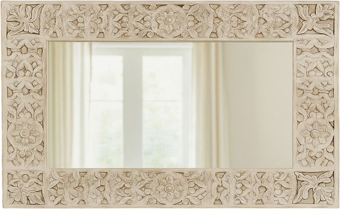 The frame of this versatile mirror is constructed, using tongue and groove joint methods, of mango wood in a water resistant lacquer sealed white wash finish. As with all of the pieces in the Carved Lace group-extensive hand carved and routed detail is showcased.Read More