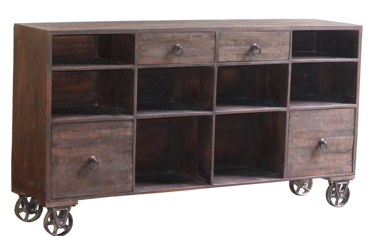This versatile silhouette-which also makes a great entry catchall, kitchen counter, sideboard, etc- features black power coated cast iron ring style pulls-and wheels