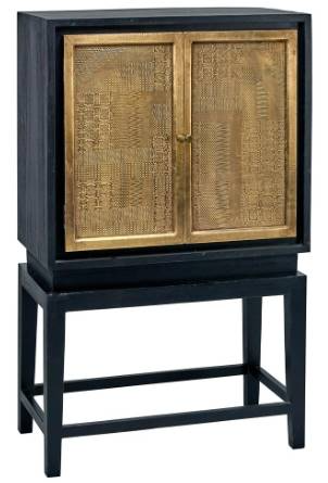 This cabinet is constructed, using tongue and groove joint methods, of mango wood in water resistant lacquer sealed antique black finish-with MDF used as stable platform for the hand stamped brass sheeting door front overlays. Features include simple brass knobs and interior storage for stemmed glasses and bottles-and the stand.Read More