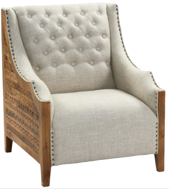 Features include neutral button tufted polyester upholstery and individually set nail head trim