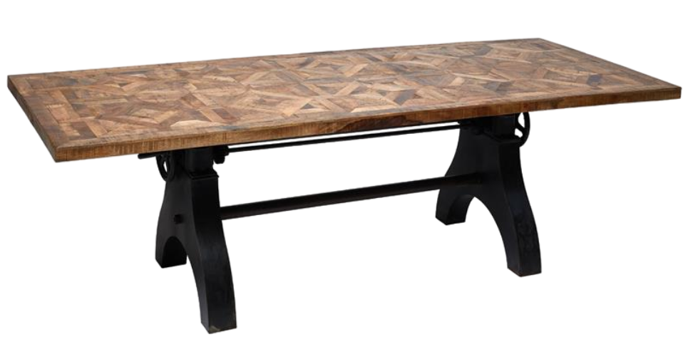 The top of this Warm Industrial style table is constructed, using tongue and groove joint methods, of mango wood-with an intricate pattern created by carefully hand setting strips of timber over the core-all in a water resistant lacquer sealed multi step blended finish
