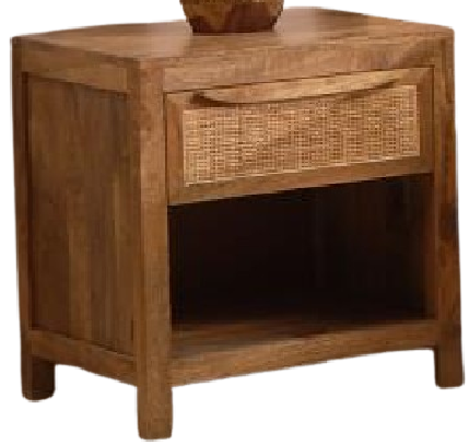 This nightstand features a drawer fronted by a framed panel of cane-locally sourced from astern India-and a "wide" cup style mango pull