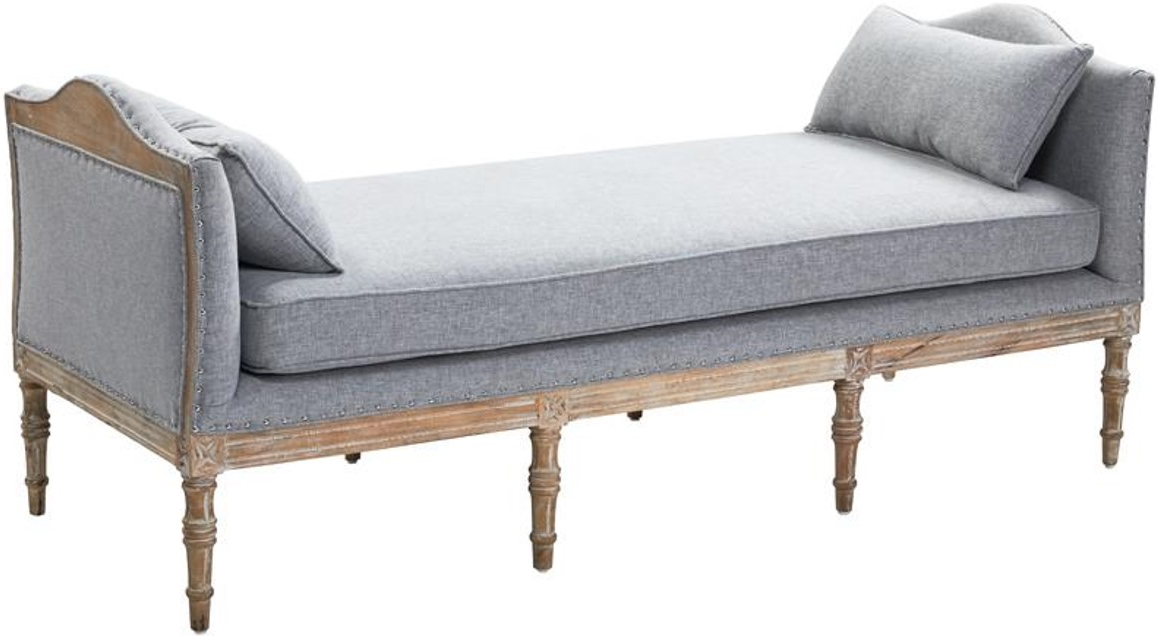 This daybed blends classic elegance with modern comfort. Featuring a wood frame with intricate carvings and a distressed finish, this upholstered daybed offers a sophisticated yet cozy seating or lounging option. The soft gray fabric, nailhead trim, and plush cushions add a refined, vintage-inspired touch.Read More