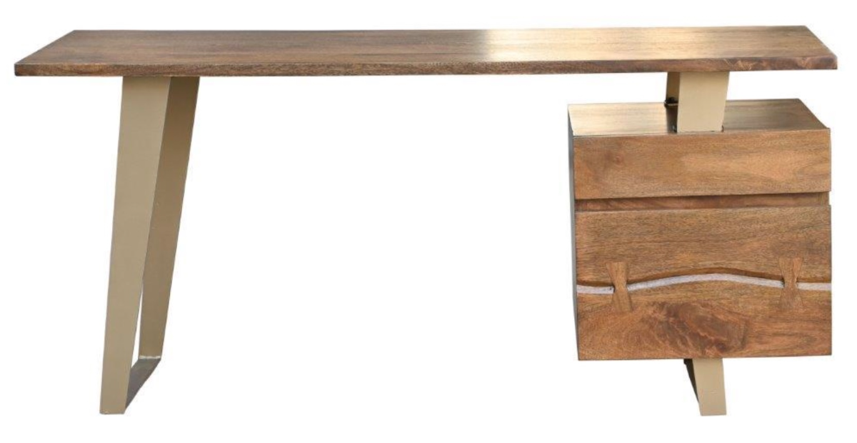 The Planck group is crafted, using tongue and groove joint methods, of acacia timber in a water resistant lacquer sealed natural finish. Features of this desk include decorative butterfly joint detail, use of the "live" edge of the wood, antique brass finished cast iron supports and metal drawer glides.Read More