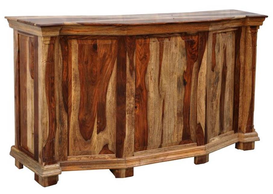 The Tahoe group is constructed of sheesham timber in a natural water-resistant lacquer sealed finish. This handsome bar counter features raised panel detailing, two solid wood drawers with black powder coated iron diamond shaped knobs, storage racks for stemmed glassware and bottles and two study shelves.Read More