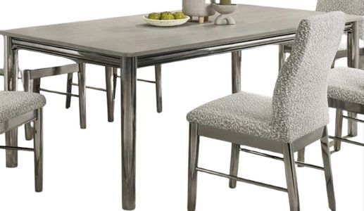 Its sleek metallic silver-finished rounded legs and table apron beautifully complement the subtle neutral tones of the tabletop, creating an upscale and harmonious ambiance. Paired with the matching upholstered side chairs, crafted from solid Rubberwood, this set exudes durability and refined style. The chairs feature soft, pale gray boucle fabric upholstery, offering a textured elegance that blends plush, high-end comfort with inviting warmth. Together, the Lennox dining table and chairs set creates a cohesive centerpiece for memorable gatherings and cherished family moments.