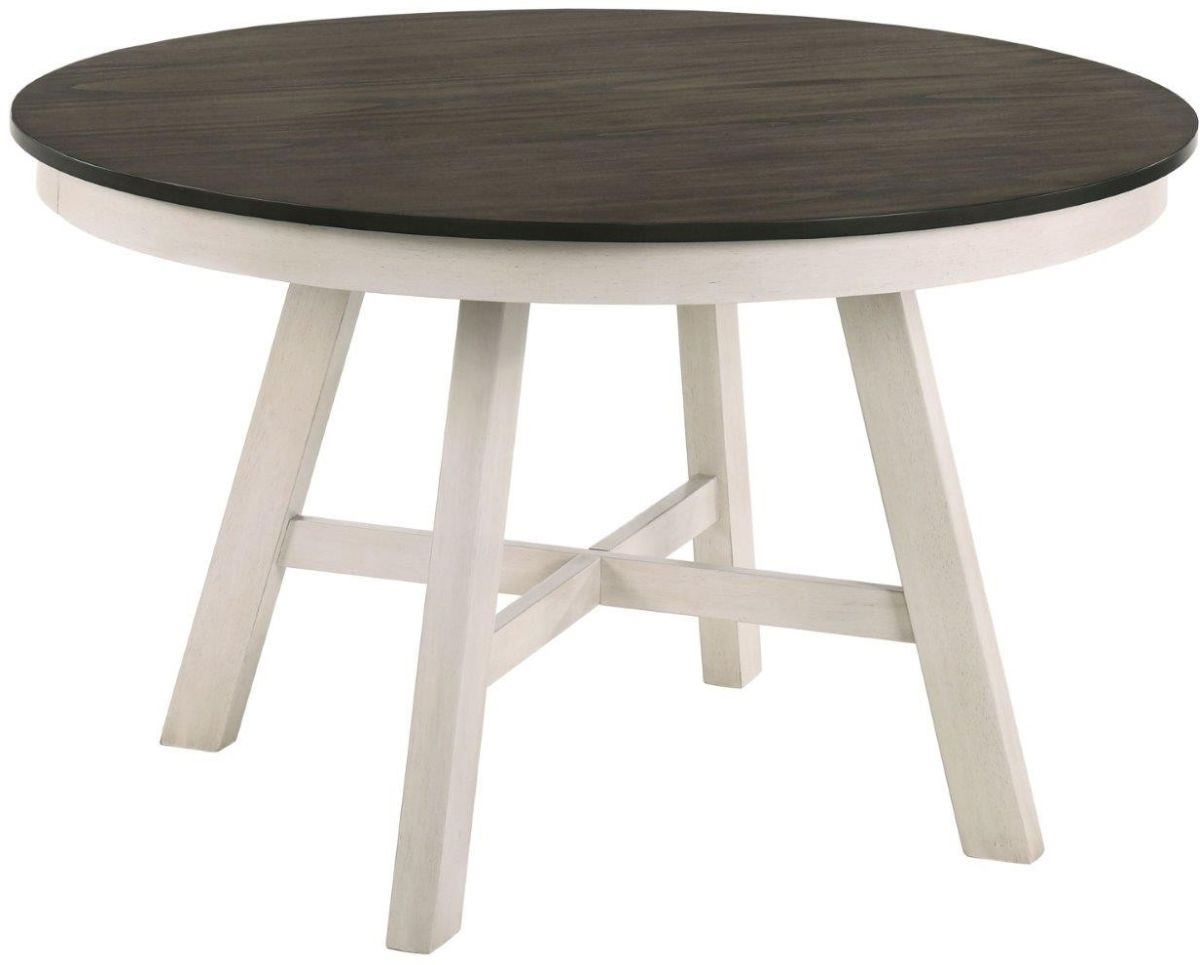 The Maisie dining table is made from rubberwood solids and mindy veneers. This two-tone finish. It's painted brown color on the table top and white color on the base.