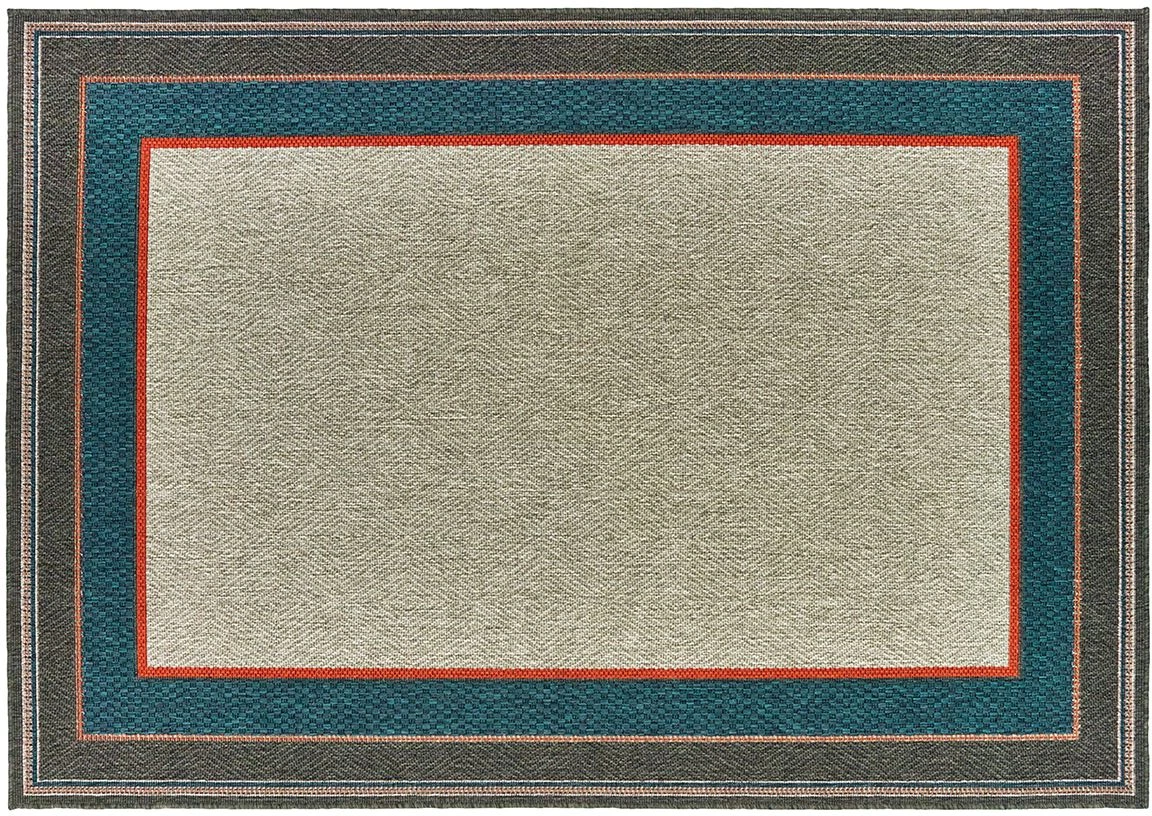 The collection Latitude exhibits sophisticated designs ranging from traditional patterns of tiles and medallions to simple modern borders and geometrics. Multi-colored yarns in neutral grays, accentuated by profound navy tones and vibrant persimmon, add underfoot texture and color pop. Polypropylene machine-woven, Latitude is simple to look after and can be used indoors and outdoors.