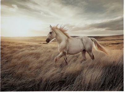 This wall art brings serene beauty to your home. This captivating print on glass captures the grace and majesty of a wild horse galloping through a golden field. The warm, earthy tones and dynamic composition create a sense of freedom and movement. It's a perfect choice to enhance your wall decor with nature-inspired artistry.Read More