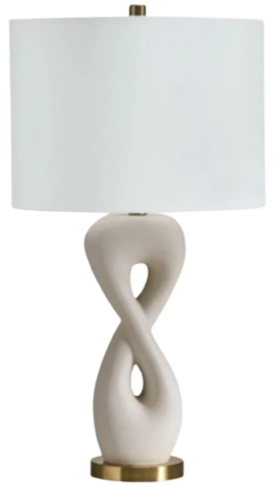 Cool curves. Contemporary character. With this table lamp, you get elevated form and modern function in one delightfully artistic package. The figure-eight style shape has an eye-catching sense of movement, platformed by a sleek goldtone base. Stage it alone on an accent table, or pair it with sculptures and other decor for maximum impact.Read More