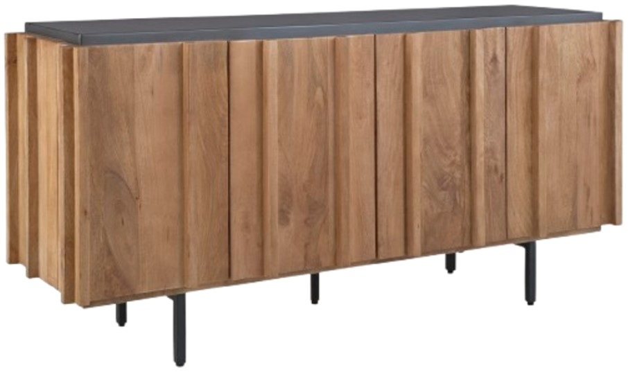 This striking accent cabinet offers a magnificently modern vibe with its high-low design and sleek metal legs. Bathed in an inviting light brown finish, it features a contrasting charcoal gray top for a touch of industrial chic. Four doors conceal fixed shelves, providing ample storage space.Read More