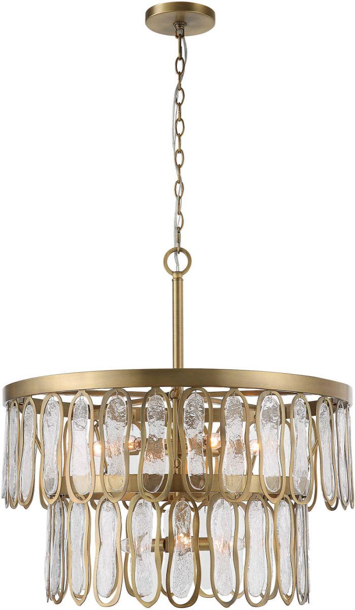 This two tier stacked 9 Light Pendant is both artistic and stylish featuring organic watered and seeded clear glass accents outlined with a rich antique brass contours. The cleverly simple frame has the same rich antique brass finish. 9-60 watt max candelabra sockets. Bulbs not included.Read More