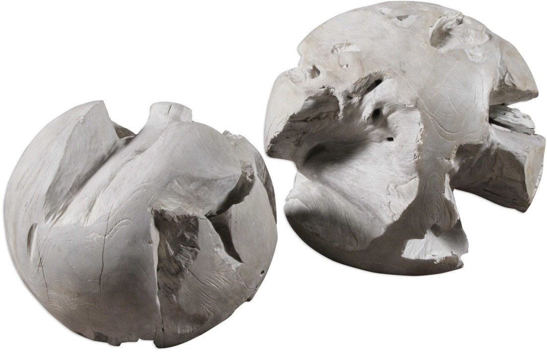 This set of decorative teak balls, will bring a rustic and warm atmosphere to any bare corner, balcony or terrace. Beautifully handcrafted and finished with a pale gray glaze. Each will vary in size due to being uniquely handcrafted. Cracks and variations in grain are normal. Sizes: Sm-12"rd, Lg-16"rd